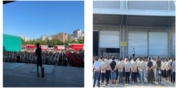 2021年7月14日厦门总部生产基地组织二、三期员工进行消防疏散演练,总指挥一声令下演练开始,制二课车间报告火情,请求疏散和灭火支援,总指挥接到报告...